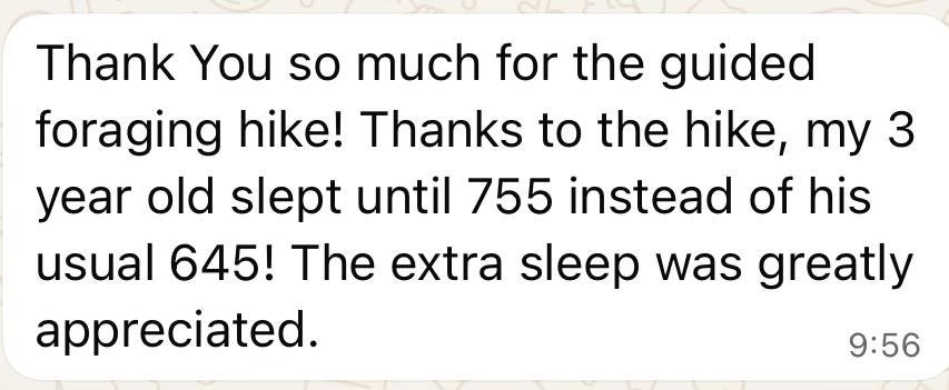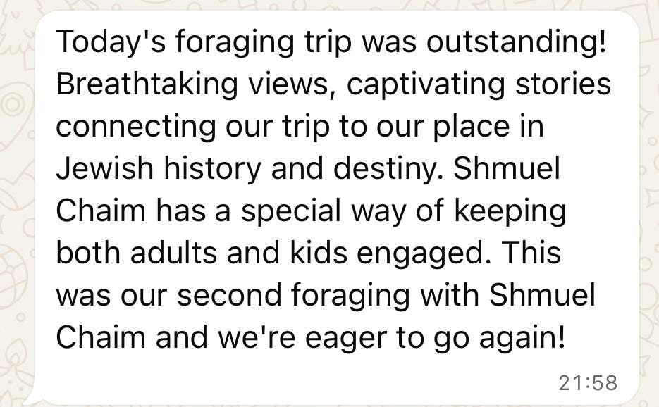 Shmuel Chaim Naiman’s foraging trip was such a special experience for our family! It was the perfect blend of nature and history, offering both adventure and education in a way that kept all my kids (and me!) engaged and inspired to learn more. Being able to forage and eat wild foods in real-time was truly unique and unforgettable. The way Shmuel Chaim Naiman shares his knowledge and passion made the experience even more special. This is a very hands-on approach - bringing history and nature to life in a way we’ve never experienced before. I Highly recommend this for anyone looking for an immersive, one-of-a-kind outdoor adventure. — Shmuel Meyers, Louisville, Kentucky